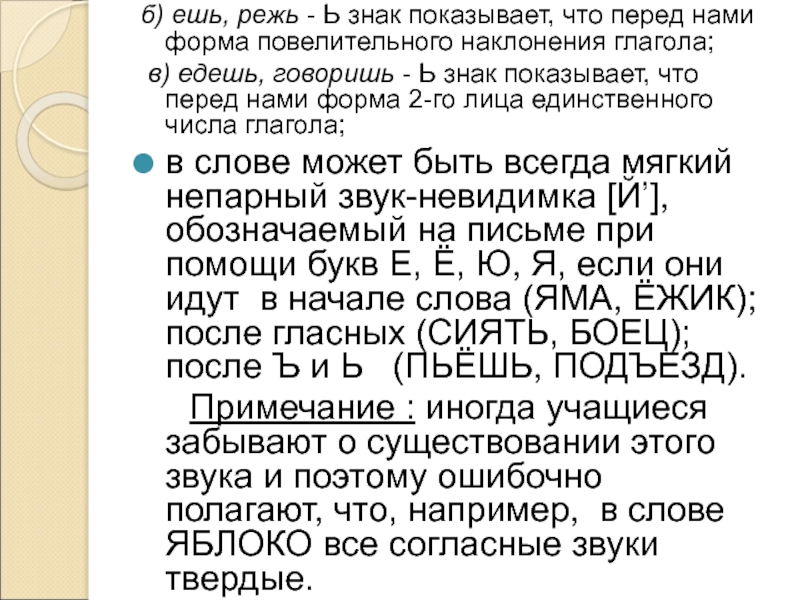 Примечание : иногда учащиеся забывают о существовании этого звука и поэтому ошибочно полагают, что, например, в слове ЯБЛОКО все согласные звуки твердые.