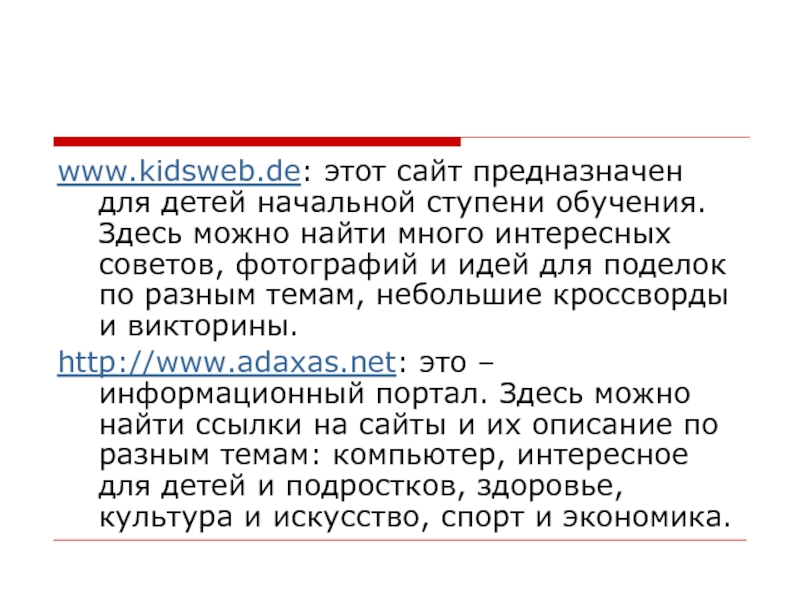 Слайд 13www.kidsweb.de: этот сайт предназначен для детей начальной ступени обучения. Здесь можно