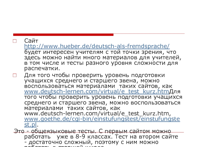Слайд 24Сайт http://www.hueber.de/deutsch-als-fremdsprache/ будет интересен учителям с той точки зрения, что здесь