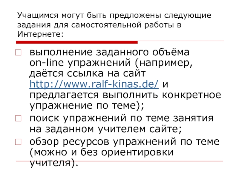 Слайд 33Учащимся могут быть предложены следующие задания для самостоятельной работы в Интернете: