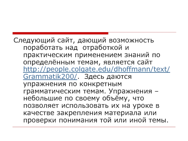 по определённым темам, является сайт http://people.colgate.edu/dhoffmann/text/Grammatik200/. Здесь даются упражнения по конкретным грамматическим темам. Упражнения – небольшие по своему объёму, что позволяет использовать их на уроке в качестве закрепления материала или проверки понимания той или иной темы.