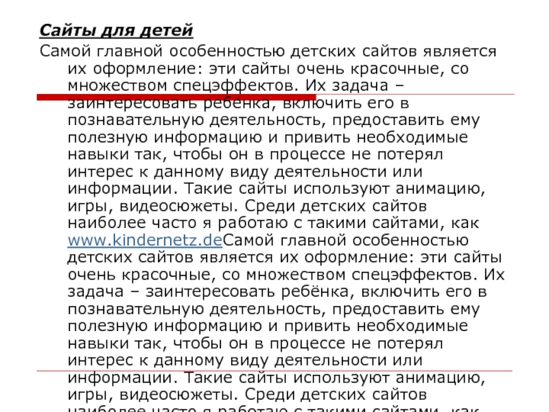 сайты очень красочные, со множеством спецэффектов. Их задача – заинтересовать ребёнка, включить его в познавательную деятельность, предоставить ему полезную информацию и привить необходимые навыки так, чтобы он в процессе не потерял интерес к данному виду деятельности или информации. Такие сайты используют анимацию, игры, видеосюжеты. Среди детских сайтов наиболее часто я работаю с такими сайтами, как www.kindernetz.deСамой главной особенностью детских сайтов является их оформление: эти сайты очень красочные, со множеством спецэффектов. Их задача – заинтересовать ребёнка, включить его в познавательную деятельность, предоставить ему полезную информацию и привить необходимые навыки так, чтобы он в процессе не потерял интерес к данному виду деятельности или информации. Такие сайты используют анимацию, игры, видеосюжеты. Среди детских сайтов наиболее часто я работаю с такими сайтами, как www.kindernetz.de, www.kindersache.deСамой главной особенностью детских сайтов является их оформление: эти сайты очень красочные, со множеством спецэффектов. Их задача – заинтересовать ребёнка, включить его в познавательную деятельность, предоставить ему полезную информацию и привить необходимые навыки так, чтобы он в процессе не потерял интерес к данному виду деятельности или информации. Такие сайты используют анимацию, игры, видеосюжеты. Среди детских сайтов наиболее часто я работаю с такими сайтами, как www.kindernetz.de, www.kindersache.de, www.kidsweb.deСамой главной особенностью детских сайтов является их оформление: эти сайты очень красочные, со множеством спецэффектов. Их задача – заинтересовать ребёнка, включить его в познавательную деятельность, предоставить ему полезную информацию и привить необходимые навыки так, чтобы он в процессе не потерял интерес к данному виду деятельности или информации. Такие сайты используют анимацию, игры, видеосюжеты. Среди детских сайтов наиболее часто я работаю с такими сайтами, как www.kindernetz.de, www.kindersache.de, www.kidsweb.de, http://www.kika.de,. Первые три сайта можно использовать на уроках, начиная со второго года обучения. Здесь представлены в основном игры и поделки, но есть и небольшие тексты по интересным темам.