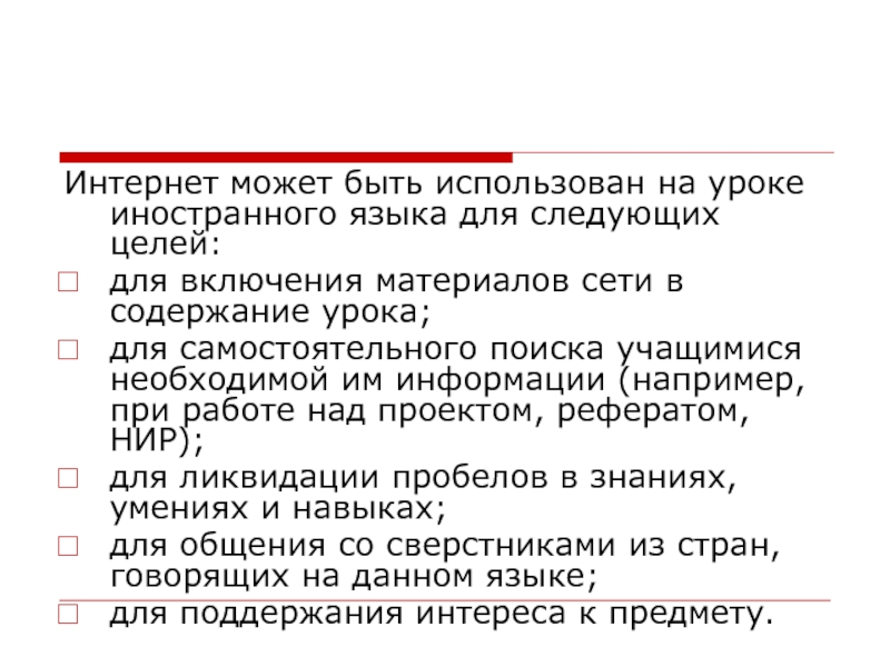 Слайд 8Интернет может быть использован на уроке иностранного языка для следующих целей: