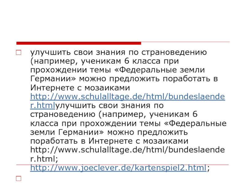 темы «Федеральные земли Германии» можно предложить поработать в Интернете с мозаиками http://www.schulalltage.de/html/bundeslaender.htmlулучшить свои знания по страноведению (например, ученикам 6 класса при прохождении темы «Федеральные земли Германии» можно предложить поработать в Интернете с мозаиками http://www.schulalltage.de/html/bundeslaender.html; http://www.joeclever.de/kartenspiel2.html;