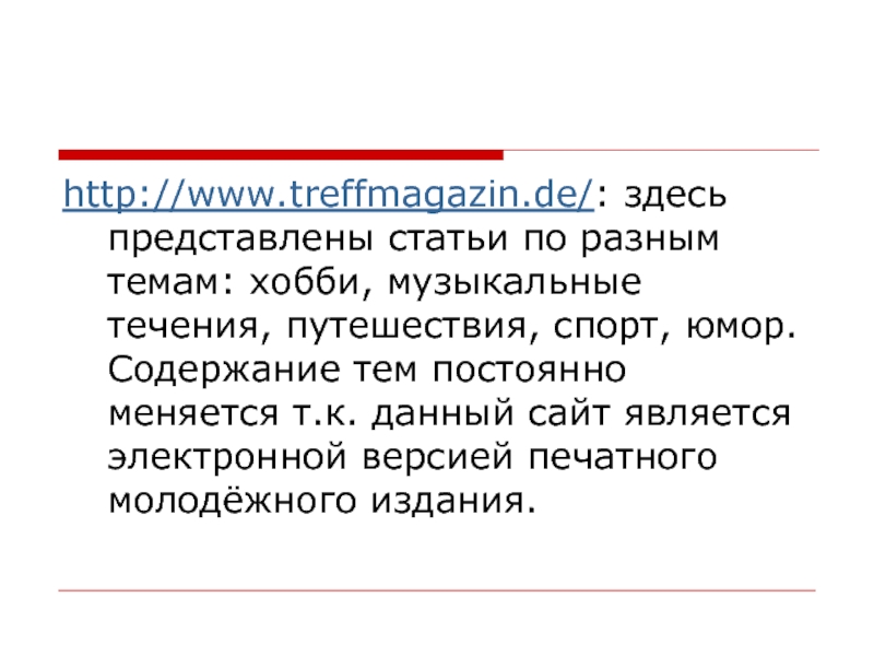 Слайд 18http://www.treffmagazin.de/: здесь представлены статьи по разным темам: хобби, музыкальные течения, путешествия,