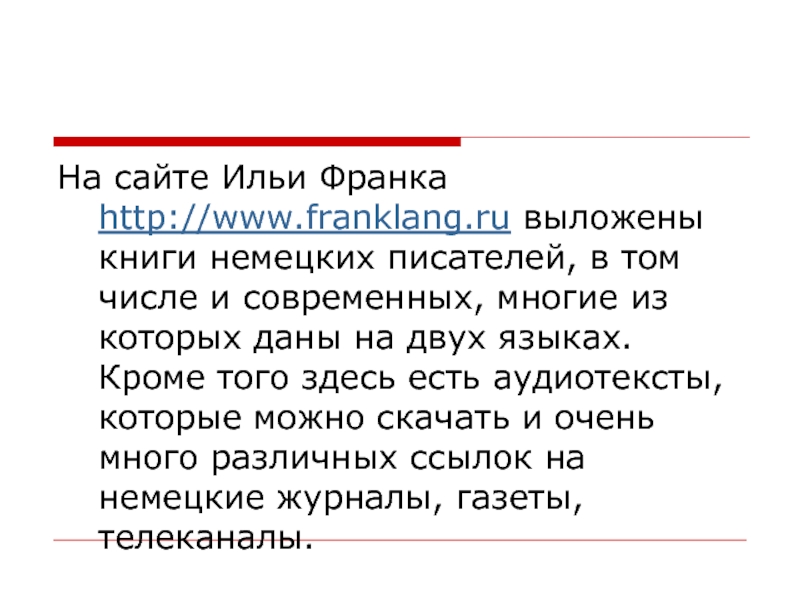 Слайд 31На сайте Ильи Франка http://www.franklang.ru выложены книги немецких писателей, в том