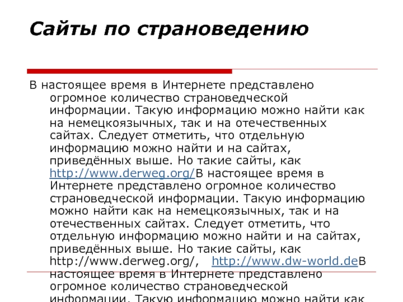 информации. Такую информацию можно найти как на немецкоязычных, так и на отечественных сайтах. Следует отметить, что отдельную информацию можно найти и на сайтах, приведённых выше. Но такие сайты, как http://www.derweg.org/В настоящее время в Интернете представлено огромное количество страноведческой информации. Такую информацию можно найти как на немецкоязычных, так и на отечественных сайтах. Следует отметить, что отдельную информацию можно найти и на сайтах, приведённых выше. Но такие сайты, как http://www.derweg.org/, http://www.dw-world.deВ настоящее время в Интернете представлено огромное количество страноведческой информации. Такую информацию можно найти как на немецкоязычных, так и на отечественных сайтах. Следует отметить, что отдельную информацию можно найти и на сайтах, приведённых выше. Но такие сайты, как http://www.derweg.org/, http://www.dw-world.de, http://bestedeutschlehrerin.narod.ru/DeutschlandWebcam.htmВ настоящее время в Интернете представлено огромное количество страноведческой информации. Такую информацию можно найти как на немецкоязычных, так и на отечественных сайтах. Следует отметить, что отдельную информацию можно найти и на сайтах, приведённых выше. Но такие сайты, как http://www.derweg.org/, http://www.dw-world.de, http://bestedeutschlehrerin.narod.ru/DeutschlandWebcam.htm, http://www.klick-an.hagemann.deВ настоящее время в Интернете представлено огромное количество страноведческой информации. Такую информацию можно найти как на немецкоязычных, так и на отечественных сайтах. Следует отметить, что отдельную информацию можно найти и на сайтах, приведённых выше. Но такие сайты, как http://www.derweg.org/, http://www.dw-world.de, http://bestedeutschlehrerin.narod.ru/DeutschlandWebcam.htm, http://www.klick-an.hagemann.de, http://deutsch.passivhaus-info.orgВ настоящее время в Интернете представлено огромное количество страноведческой информации. Такую информацию можно найти как на немецкоязычных, так и на отечественных сайтах. Следует отметить, что отдельную информацию можно найти и на сайтах, приведённых выше. Но такие сайты, как http://www.derweg.org/, http://www.dw-world.de, http://bestedeutschlehrerin.narod.ru/DeutschlandWebcam.htm, http://www.klick-an.hagemann.de, http://deutsch.passivhaus-info.org, http://www.franklang.ru посвящены именно Германии, её культуре, событиям и достопримечательностям.