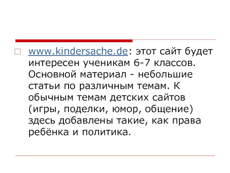 Слайд 12www.kindersache.de: этот сайт будет интересен ученикам 6-7 классов. Основной материал -