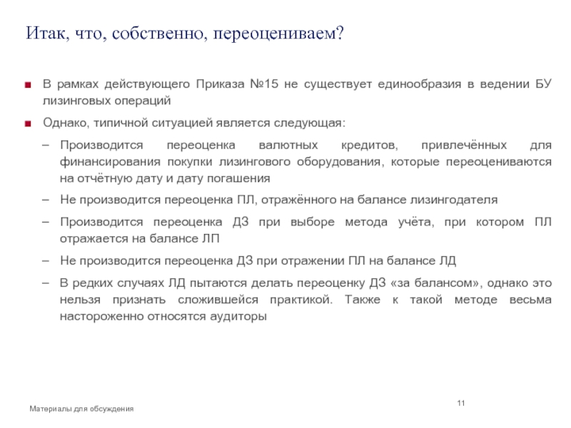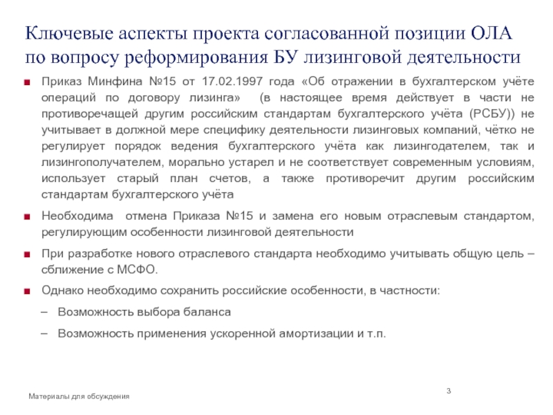 Приказ Минфина №15 от 17.02.1997 года «Об отражении в бухгалтерском учёте операций по договору лизинга» (в настоящее время действует в части не противоречащей другим российским стандартам бухгалтерского учёта (РСБУ)) не учитывает в должной мере специфику деятельности лизинговых компаний, чётко не регулирует порядок ведения бухгалтерского учёта как лизингодателем, так и лизингополучателем, морально устарел и не соответствует современным условиям, использует старый план счетов, а также противоречит другим российским стандартам бухгалтерского учёта