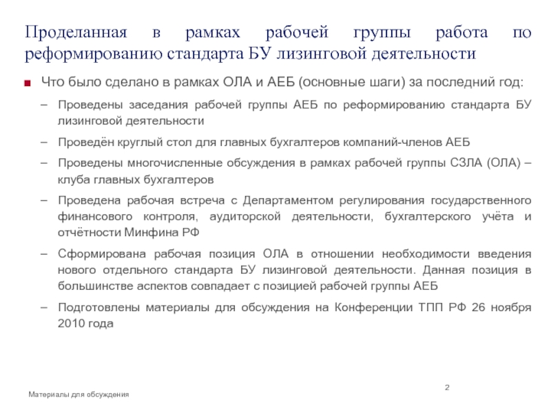 Сформирована рабочая позиция ОЛА в отношении необходимости введения нового отдельного стандарта БУ лизинговой деятельности. Данная позиция в большинстве аспектов совпадает с позицией рабочей группы АЕБ
