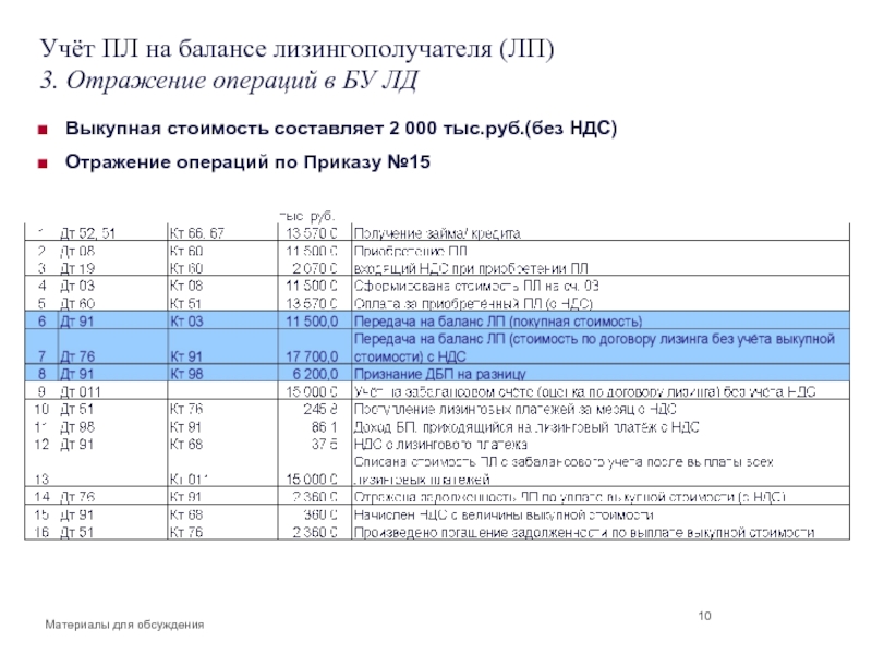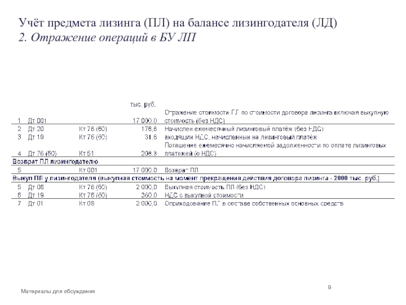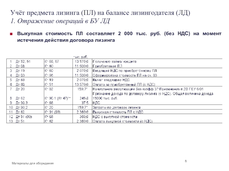 Выкупная стоимость ПЛ составляет 2 000 тыс. руб. (без НДС) на момент истечения действия договора лизинга