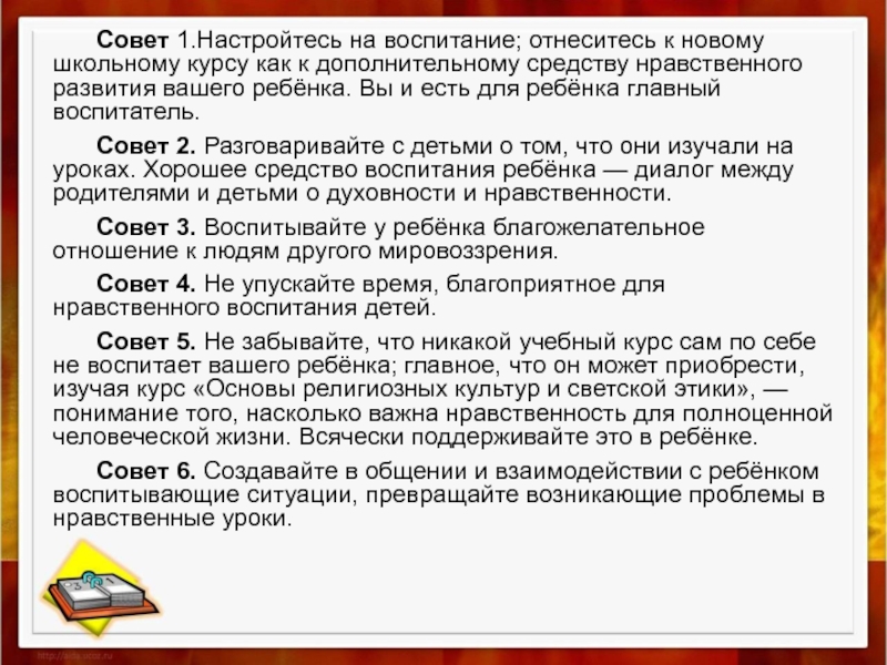 Совет 5. Не забывайте, что никакой учебный курс сам по себе не воспитает вашего ребёнка; главное, что он может приобрести, изучая курс «Основы религиозных культур и светской этики», — понимание того, насколько важна нравственность для полноценной человеческой жизни. Всячески поддерживайте это в ребёнке.