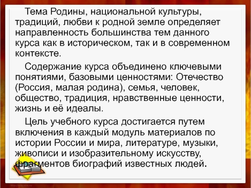 Содержание курса объединено ключевыми понятиями, базовыми ценностями: Отечество (Россия, малая родина), семья, человек, общество, традиция, нравственные ценности, жизнь и её идеалы.