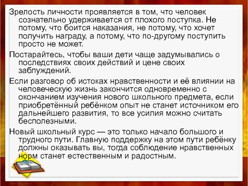 Новый школьный курс — это только начало большого и трудного пути. Главную поддержку на этом пути ребёнку должны оказывать вы, тогда соблюдение нравственных норм станет естественным и радостным.