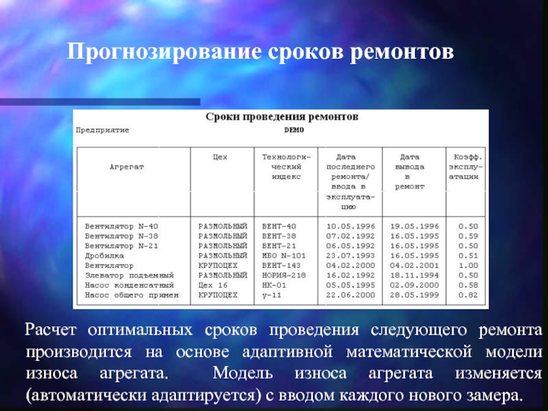на основе адаптивной математической модели износа агрегата. Модель износа агрегата изменяется (автоматически адаптируется) с вводом каждого нового замера.