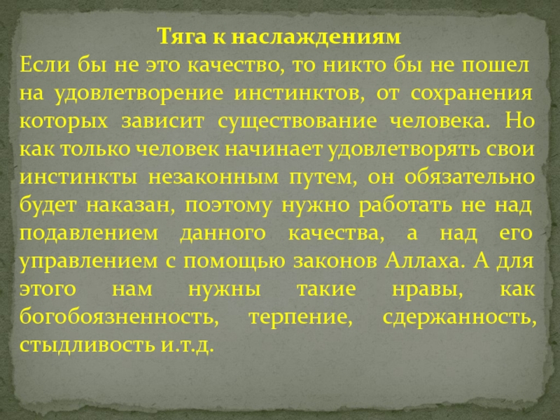 пошел на удовлетворение инстинктов, от сохранения которых зависит существование человека. Но как только человек начинает удовлетворять свои инстинкты незаконным путем, он обязательно будет наказан, поэтому нужно работать не над подавлением данного качества, а над его управлением с помощью законов Аллаха. А для этого нам нужны такие нравы, как богобоязненность, терпение, сдержанность, стыдливость и.т.д.