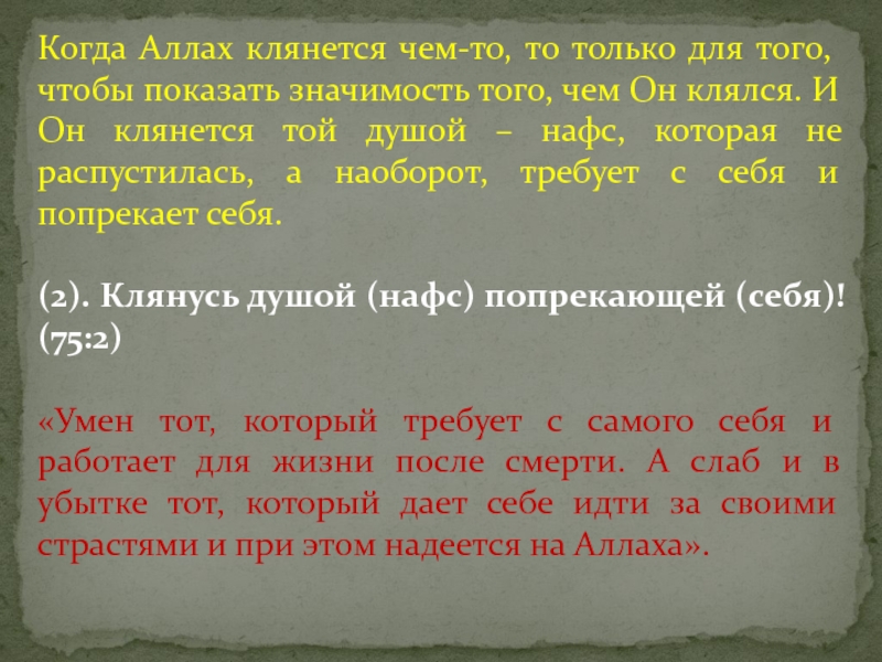 (2). Клянусь душой (нафс) попрекающей (себя)! (75:2)