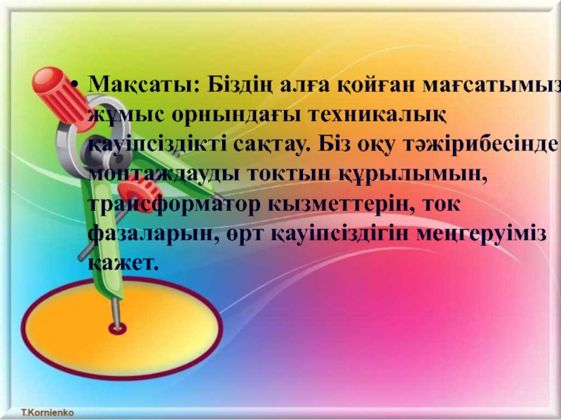 Слайд 2Мақсаты: Біздің алға қойған мағсатымыз жұмыс орнындағы техникалық қауіпсіздікті сақтау. Біз