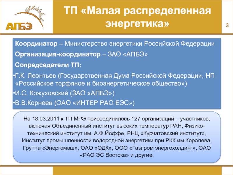 На 18.03.2011 к ТП МРЭ присоединилось 127 организаций – участников, включая Объединенный институт высоких температур РАН, Физико-технический институт им. А.Ф.Йоффе, РНЦ «Курчатовский институт», Институт промышленности водородной энергетики при РКК им.Королева, Группа «Энергомаш», ОАО «ОДК», ООО «Газпром энергохолдинг», ОАО «РАО ЭС Востока» и другие.