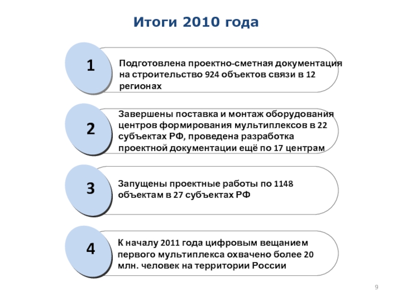 Построить 744 объекта сети ЦТВ 1-го мультиплекса, разработать проектно-сметную документацию на 1987 объектов в 39 регионах страны