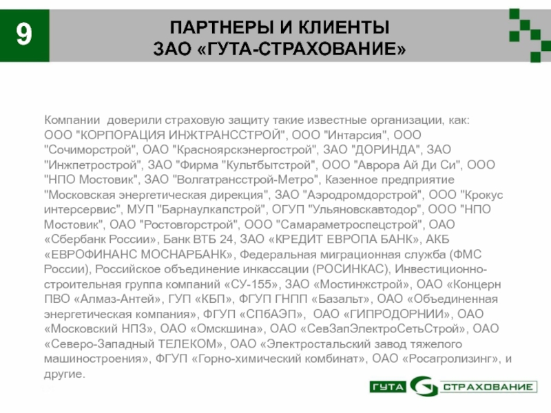 ЗАО «ГУТА-Страхование» осуществляет страхование клиентов по 82 видам страхования (включая ОСАГО).