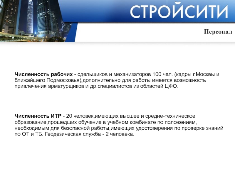 Численность ИТР - 20 человек,имеющих высшее и средне-техническое образование,прошедших обучение в учебном комбинате по положениям,необходимым для безопасной работы,имеющих удостоверения по проверке знаний по ОТ и ТБ. Геодезическая служба - 2 человека.