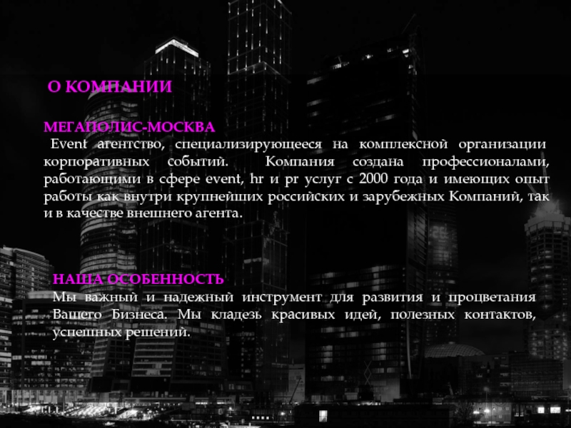 Клиентоориентированный подход – мы создаем события, которые являются мощным инструментом корпоративной культуры наших Заказчиков. Мы знаем, что вложения, связанные с организацией корпоративных мероприятий можно, при грамотном подходе, превратить в инвестиции, которые принесут колоссальную прибыль нашим Заказчикам. Именно поэтому важен комплексный подход. Именно он дает возможность увидеть ситуацию изнутри, подчеркнуть статус, уровень, философию Компании-Заказчика, найти эффективные и эффектные решения, ведущие к усилению внутренних и внешних позиций, а, следовательно, - стабильному процветанию.