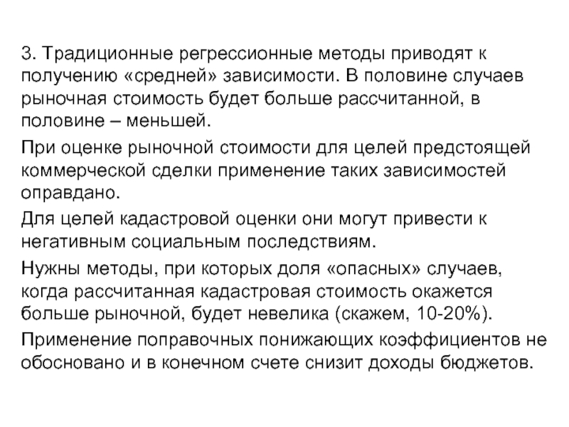 Нужны методы, при которых доля «опасных» случаев, когда рассчитанная кадастровая стоимость окажется больше рыночной, будет невелика (скажем, 10-20%).