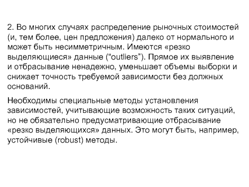 предложения) далеко от нормального и может быть несимметричным. Имеются «резко выделяющиеся» данные (“outliers”). Прямое их выявление и отбрасывание ненадежно, уменьшает объемы выборки и снижает точность требуемой зависимости без должных оснований.
