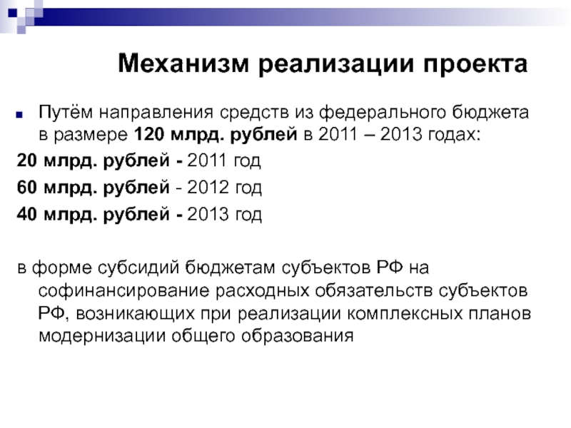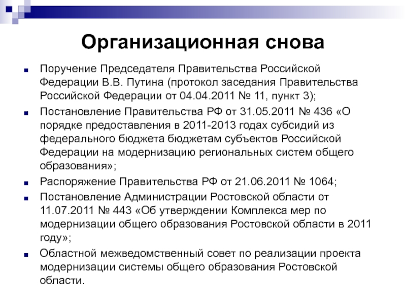 Постановление Правительства РФ от 31.05.2011 № 436 «О порядке предоставления в 2011-2013 годах субсидий из федерального бюджета бюджетам субъектов Российской Федерации на модернизацию региональных систем общего образования»;