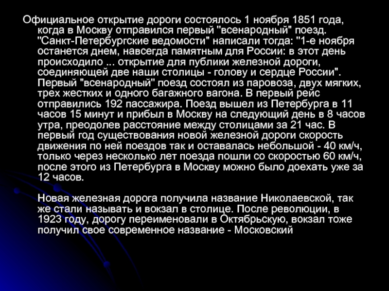 отправился первый "всенародный" поезд. "Санкт-Петербургские ведомости" написали тогда: "1-е ноября останется днем, навсегда памятным для России: в этот день происходило ... открытие для публики железной дороги, соединяющей две наши столицы - голову и сердце России". Первый "всенародный" поезд состоял из паровоза, двух мягких, трех жестких и одного багажного вагона. В первый рейс отправились 192 пассажира. Поезд вышел из Петербурга в 11 часов 15 минут и прибыл в Москву на следующий день в 8 часов утра, преодолев расстояние между столицами за 21 час. В первый год существования новой железной дороги скорость движения по ней поездов так и оставалась небольшой - 40 км/ч, только через несколько лет поезда пошли со скоростью 60 км/ч, после этого из Петербурга в Москву можно было доехать уже за 12 часов.