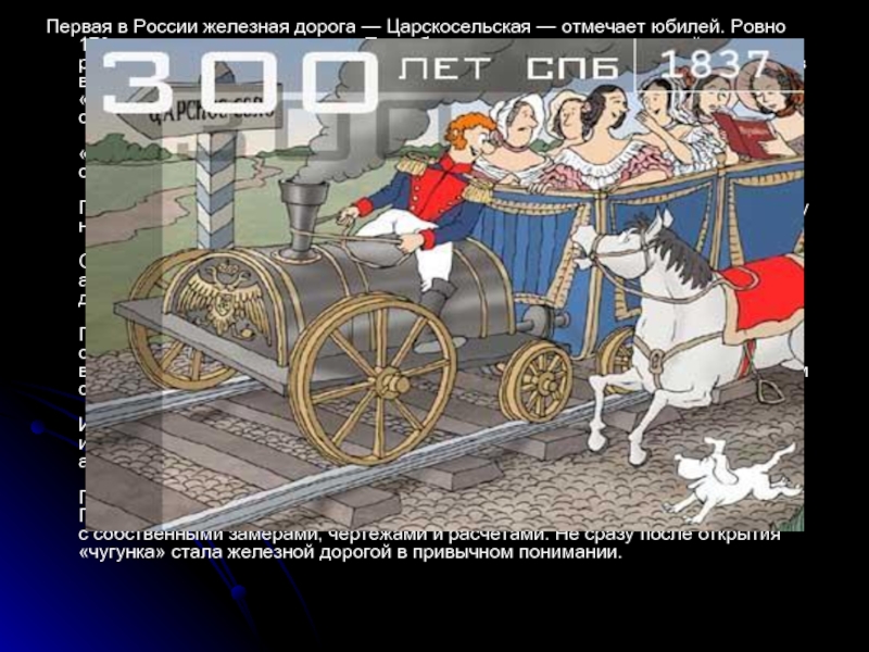 Слайд 11Первая в России железная дорога — Царскосельская — отмечает юбилей. Ровно 170 лет назад по