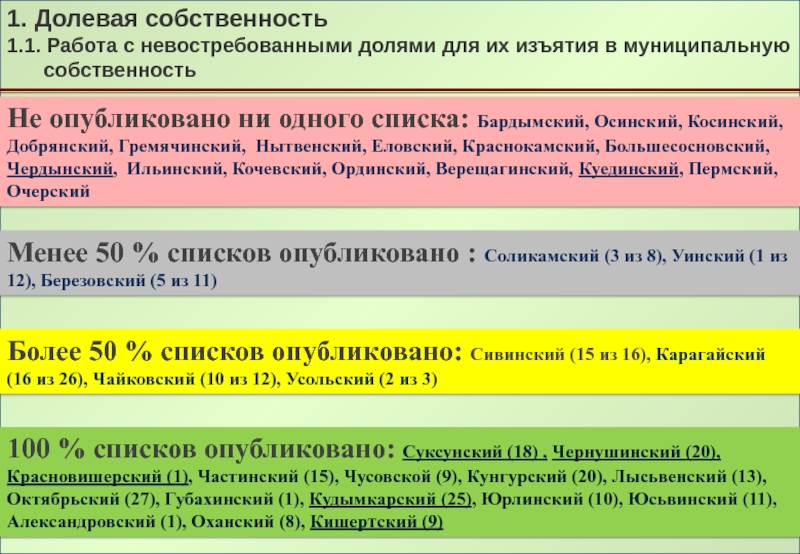 100 % списков опубликовано: Суксунский (18) , Чернушинский (20), Красновишерский (1), Частинский (15), Чусовской (9), Кунгурский (20), Лысьвенский (13), Октябрьский (27), Губахинский (1), Кудымкарский (25), Юрлинский (10), Юсьвинский (11), Александровский (1), Оханский (8), Кишертский (9)