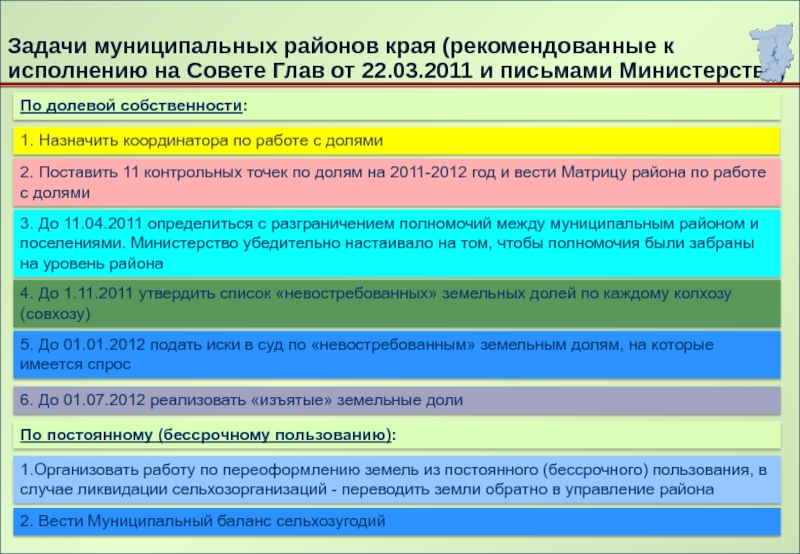 - до 15 ноября актуализировать карточки районов по работе с долевой собственностью, заполнить муниципальный баланс сельхозугодий, а также подтвердить факт публикации и утверждения долей в сроки, установленные ниже;