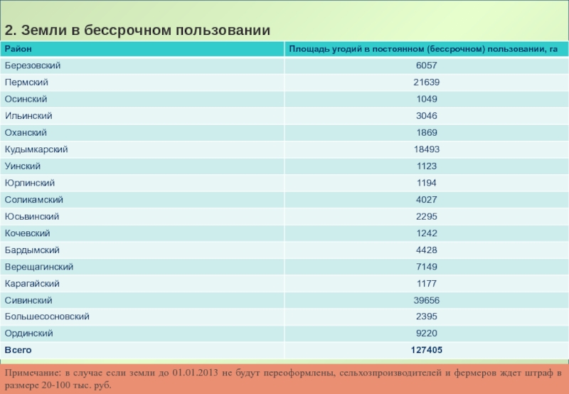 Рекомендовать муниципальным районам края по переоформлению постоянного (бессрочного) пользования:
