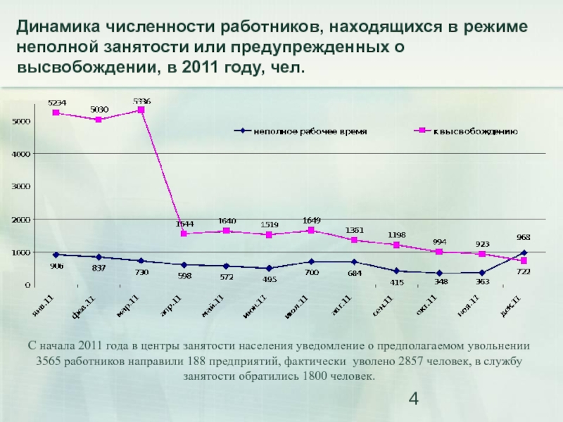 С начала 2011 года в центры занятости населения уведомление о предполагаемом увольнении 3565 работников направили 188 предприятий, фактически уволено 2857 человек, в службу занятости обратились 1800 человек.