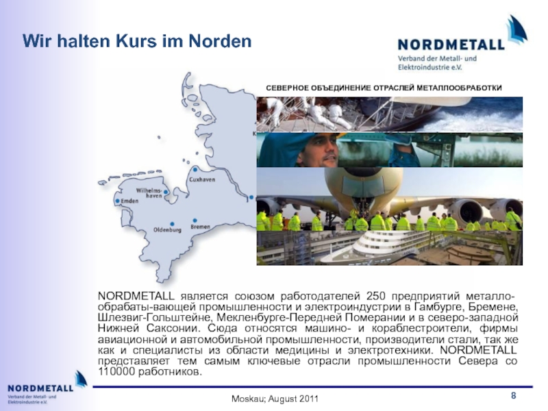 Слайд 8NORDMETALL является союзом работодателей 250 предприятий металло-обрабаты-вающей промышленности и электроиндустрии в