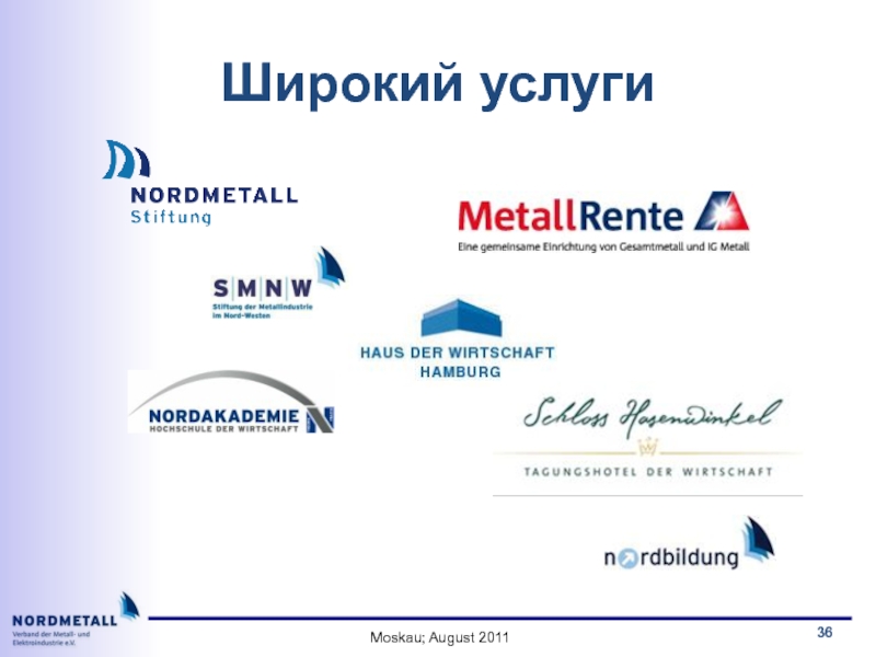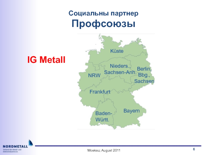 Гамбурге, Брeмeне, Шлезвиг-Гольштейне, Мекленбурге-Передней Померании и в северо-западной Нижней Саксонии. Сюда относятся машино- и кораблестроители, фирмы авиационной и автомобильной промышленности, производители стали, так же как и специалисты из области медицины и элeктротeхники. NORDMETALL представляет тeм самым ключевые отрасли промышленности Севера со 110000 работников.