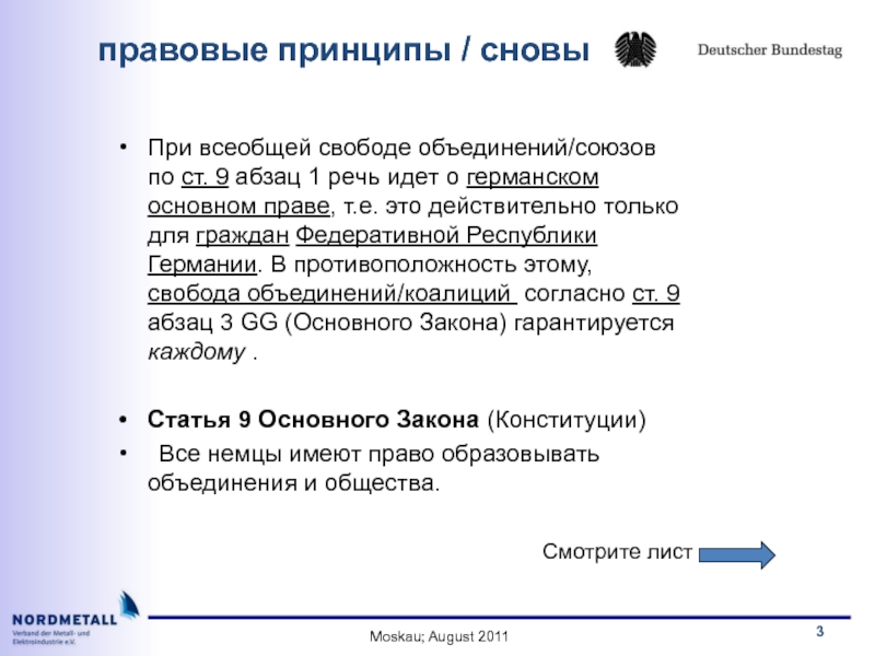 германском основном праве, т.е. это действительно только для граждан Федеративной Республики Германии. В противоположность этому, свобода объединений/коалиций согласно ст. 9 абзац 3 GG (Основного Закона) гарантируется кaждому .