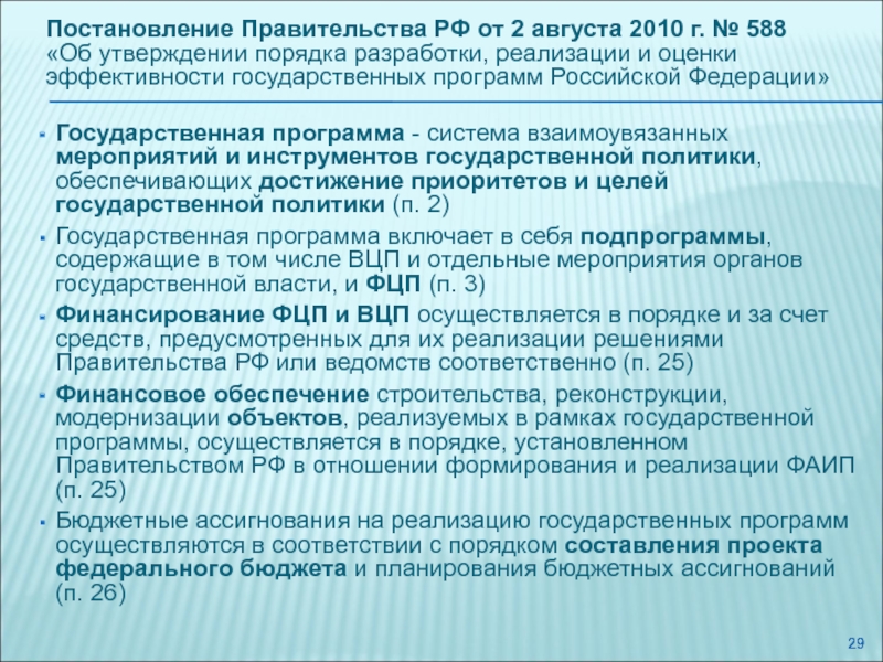 от 02.08.2010 г. № 588 Порядок разработки, реализации и оценки эффективности госпрограмм