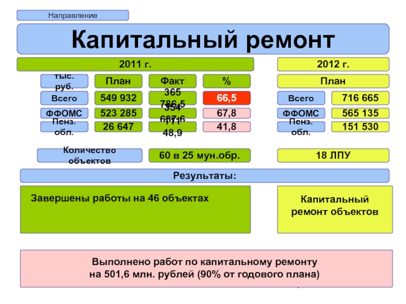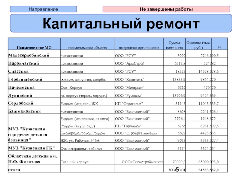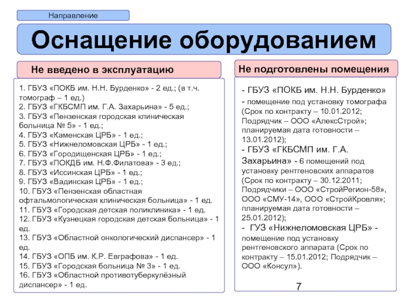 - ГБУЗ «ГКБСМП им. Г.А. Захарьина» - 6 помещений под установку рентгеновских аппаратов (Срок по контракту – 30.12.2011; Подрядчики – ООО «СтройРегион-58», ООО «СМУ-14», ООО «СтройКровля»; планируемая дата готовности – 25.01.2012);
