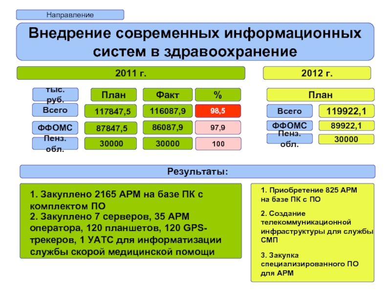 2. Закуплено 7 серверов, 35 АРМ оператора, 120 планшетов, 120 GPS-трекеров, 1 УАТС для информатизации службы скорой медицинской помощи