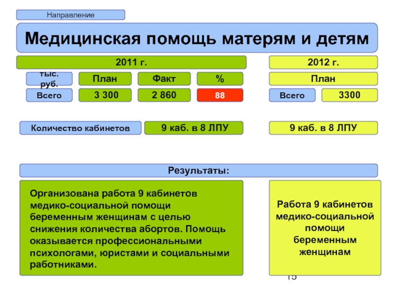 Организована работа 9 кабинетов медико-социальной помощи беременным женщинам с целью снижения количества абортов. Помощь оказывается профессиональными психологами, юристами и социальными работниками.