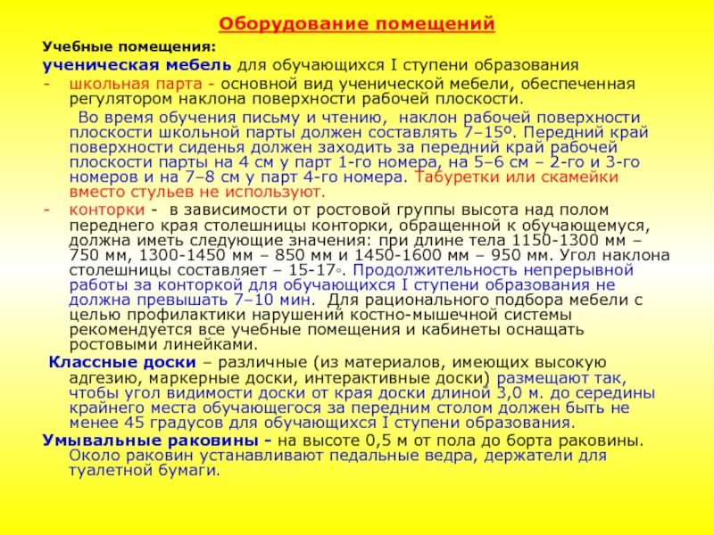 конторки - в зависимости от ростовой группы высота над полом переднего края столешницы конторки, обращенной к обучающемуся, должна иметь следующие значения: при длине тела 1150-1300 мм – 750 мм, 1300-1450 мм – 850 мм и 1450-1600 мм – 950 мм. Угол наклона столешницы составляет – 15-17◦. Продолжительность непрерывной работы за конторкой для обучающихся I ступени образования не должна превышать 7–10 мин. Для рационального подбора мебели с целью профилактики нарушений костно-мышечной системы рекомендуется все учебные помещения и кабинеты оснащать ростовыми линейками.