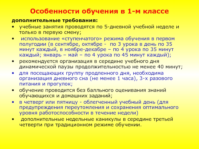 использование «ступенчатого» режима обучения в первом полугодии (в сентябре, октябре - по 3 урока в день по 35 минут каждый, в ноябре-декабре – по 4 урока по 35 минут каждый; январь – май – по 4 урока по 45 минут каждый);