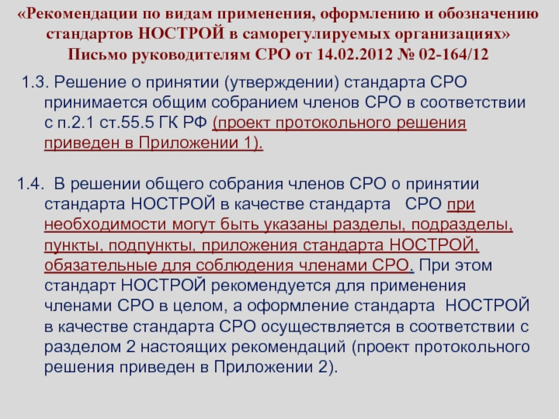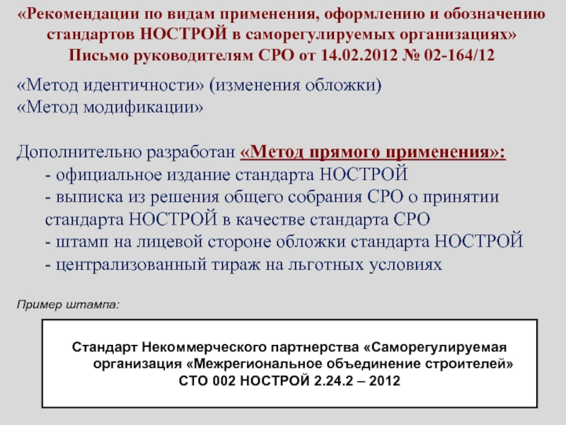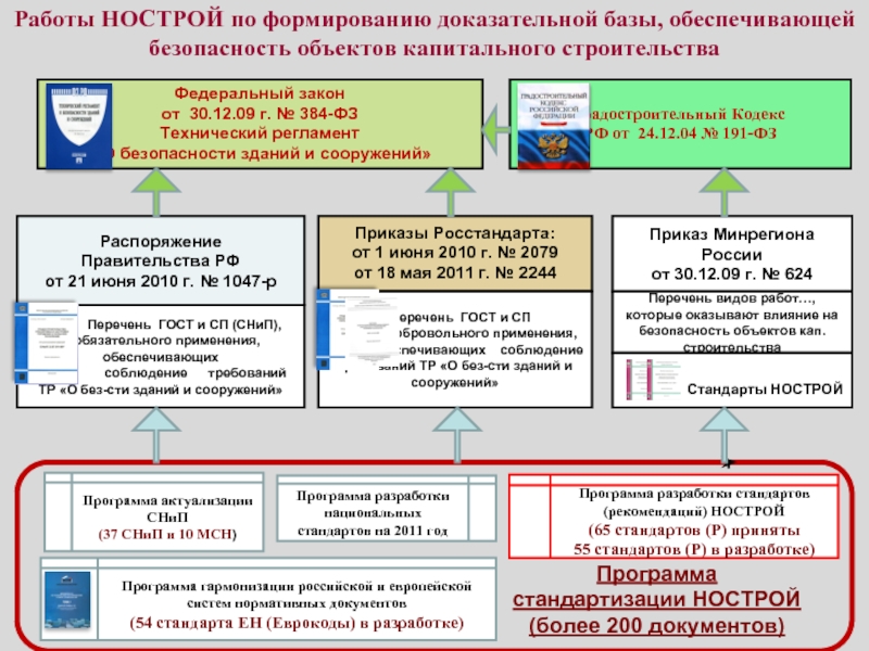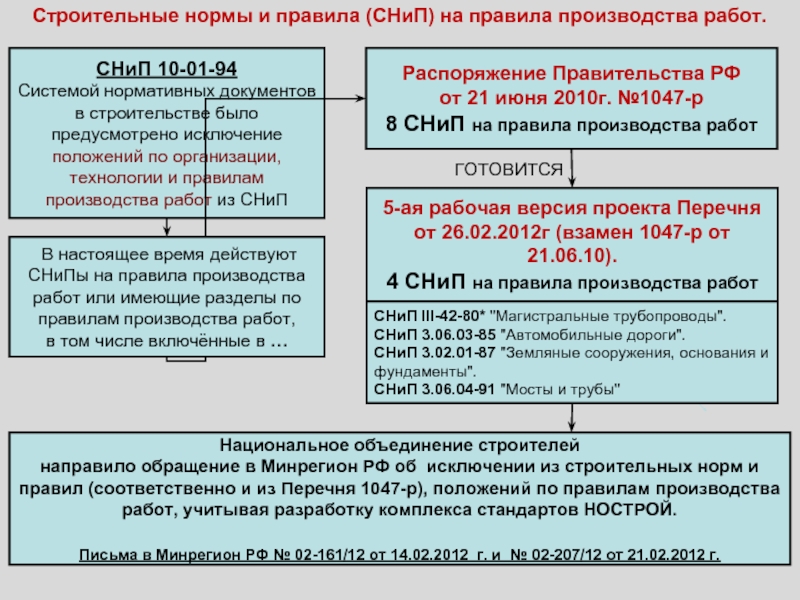 направило обращение в Минрегион РФ об исключении из строительных норм и правил (соответственно и из Перечня 1047-р), положений по правилам производства работ, учитывая разработку комплекса стандартов НОСТРОЙ.
