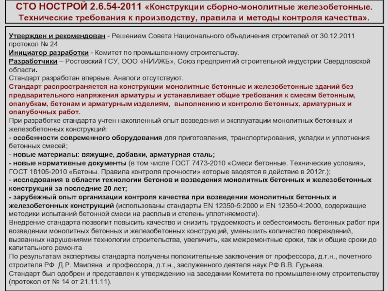 При разработке стандарта учтен накопленный опыт возведения и эксплуатации монолитных бетонных и железобетонных конструкций:
