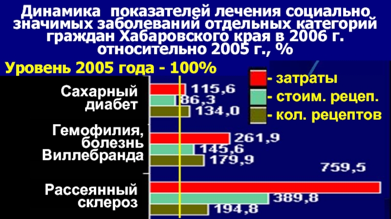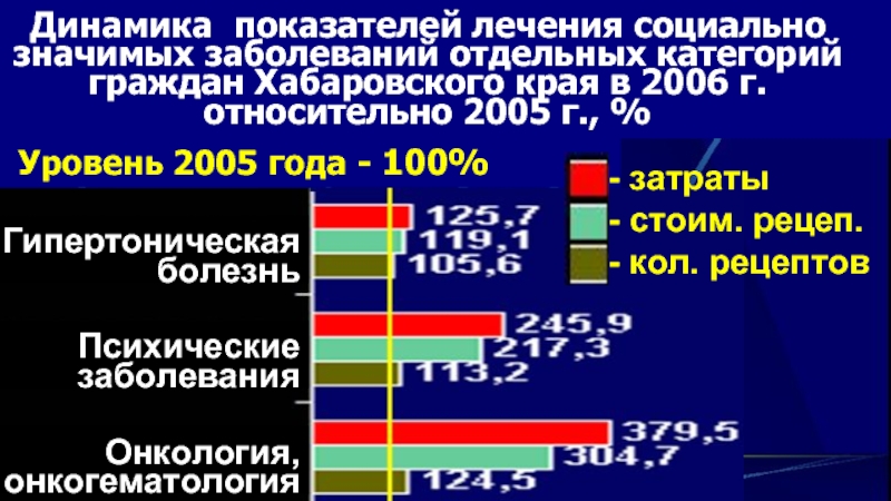 Динамика показателей лечения социально значимых заболеваний отдельных категорий граждан Хабаровского края в 2006 г. относительно 2005 г., %