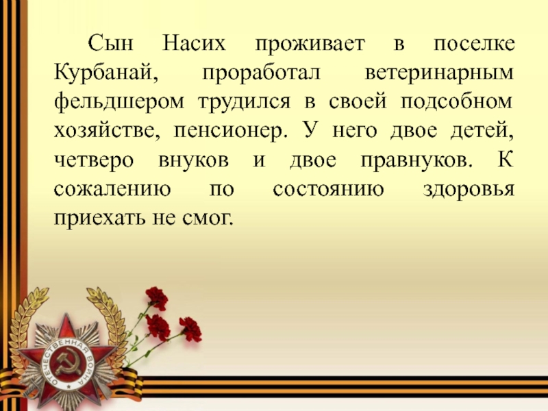Слайд 29 Сын Насих проживает в поселке Курбанай, проработал ветеринарным фельдшером трудился в