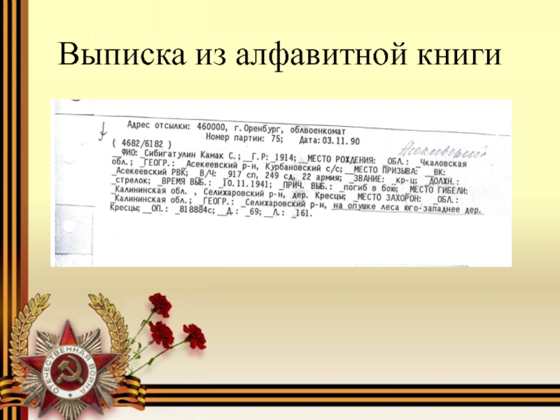 Слайд 11 Воевал в составе подразделения 917 стрелкового полка 249-й стрелковой дивизии 22